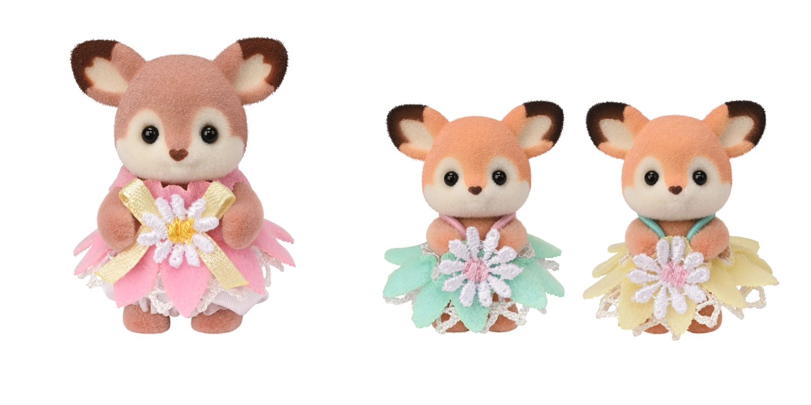 Aster, Nova and Rose have a soft velvety surface and embroidered floral dresses in pink, mint and yellow. They are easy to dress and accessorize.