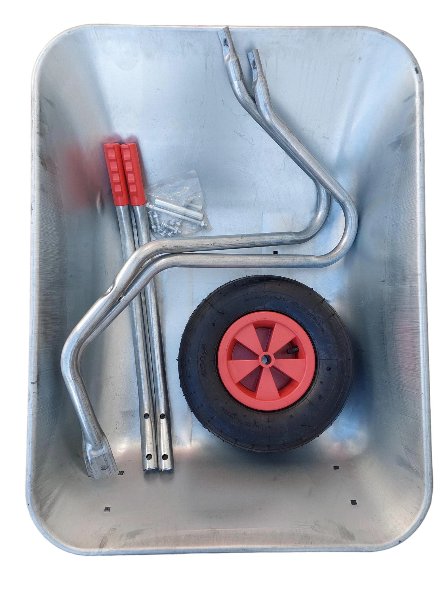 Reliable wheelbarrow for the garden, construction site, and workshop. The 65-liter galvanized tray provides high rust resistance and longer service life, while the 13"x3.50-6 inflatable wheel on a plastic rim ensures stable ride and better shock absorption on uneven surfaces. Thanks to its low weight, the wheelbarrow is easy to handle even when fully loaded.