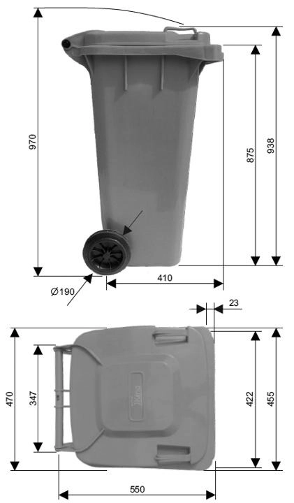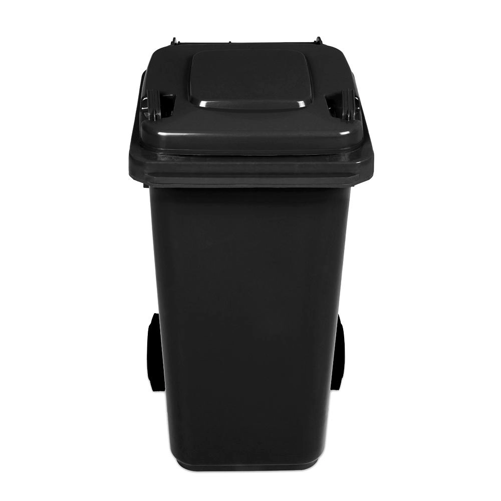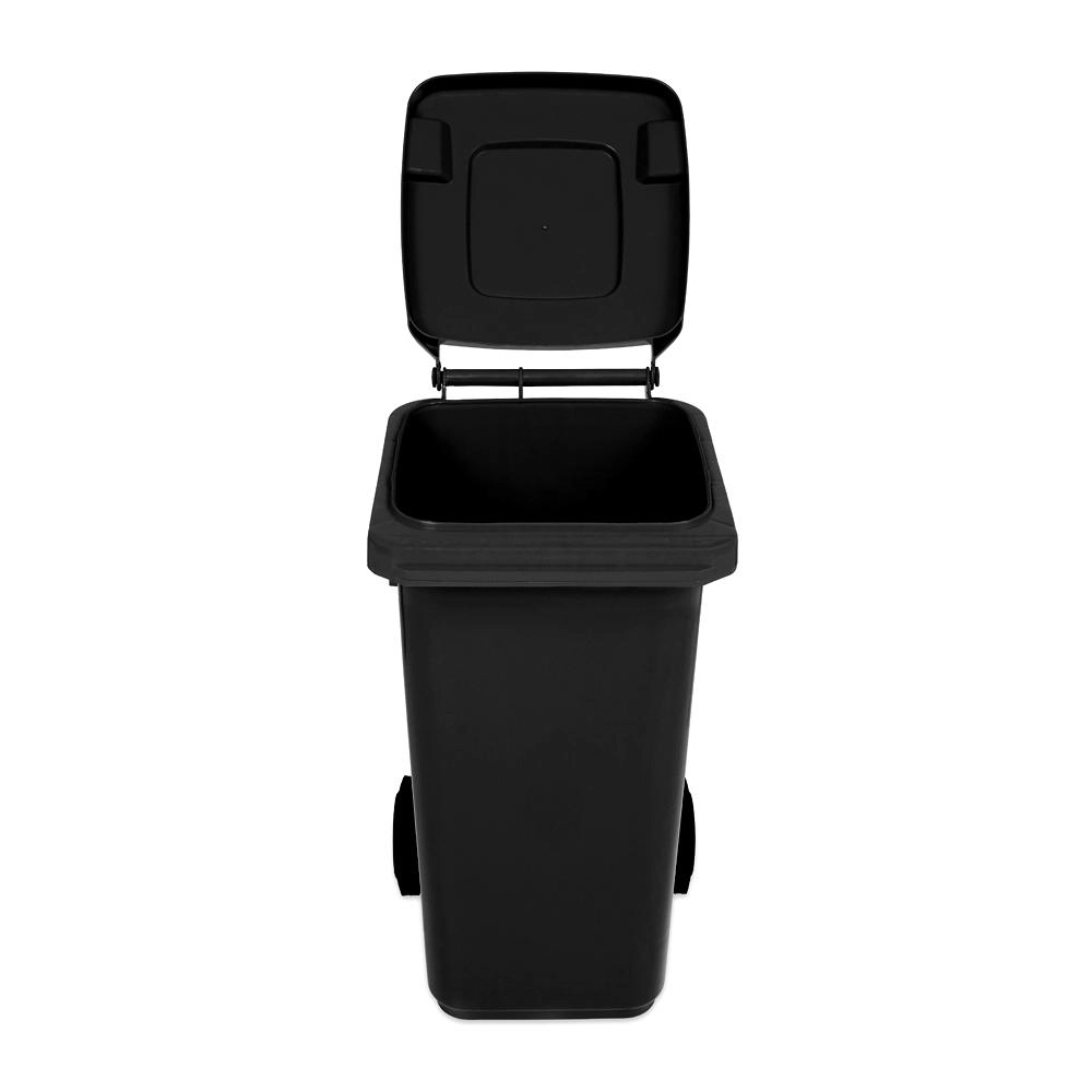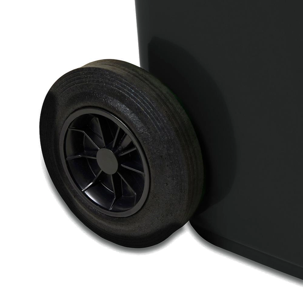 This black 120-liter plastic wheelie bin is an ideal choice for households, businesses, and facilities. Thanks to its low weight, ergonomic side handles, and a pair of sturdy wheels, the container is easy to maneuver even when fully loaded. The secure lid helps reduce odors and prevents access by pests.