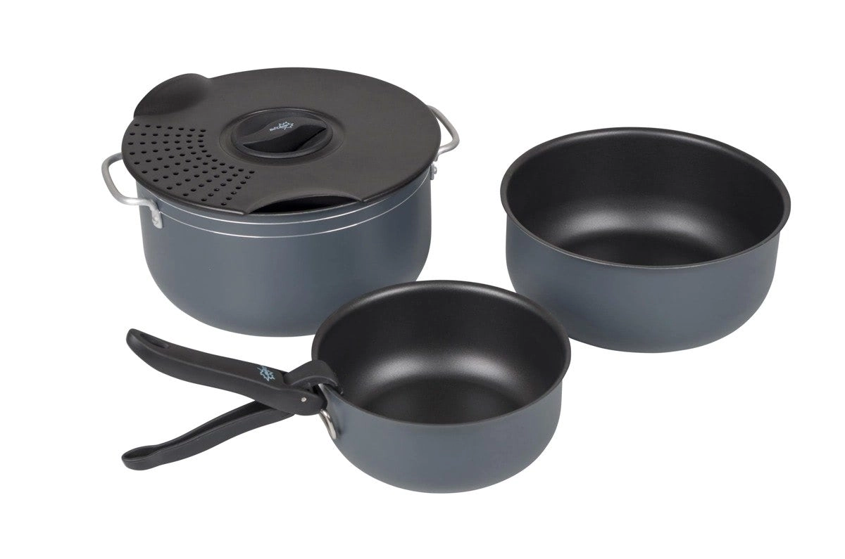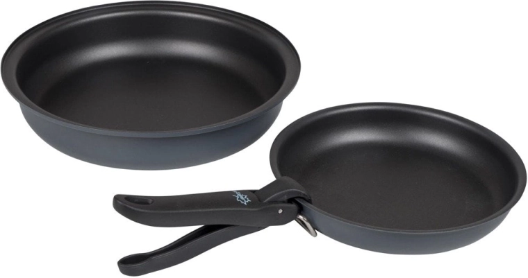 A practical and lightweight cookware set for camping and outdoor cooking. Includes 3 pots, 2 pans, a lid with strainer, and a detachable handle. Thanks to the non-stick surface, you can cook without burning and clean up easily. The set packs compactly into a protective case and is compatible with gas, ceramic, and electric cookers.