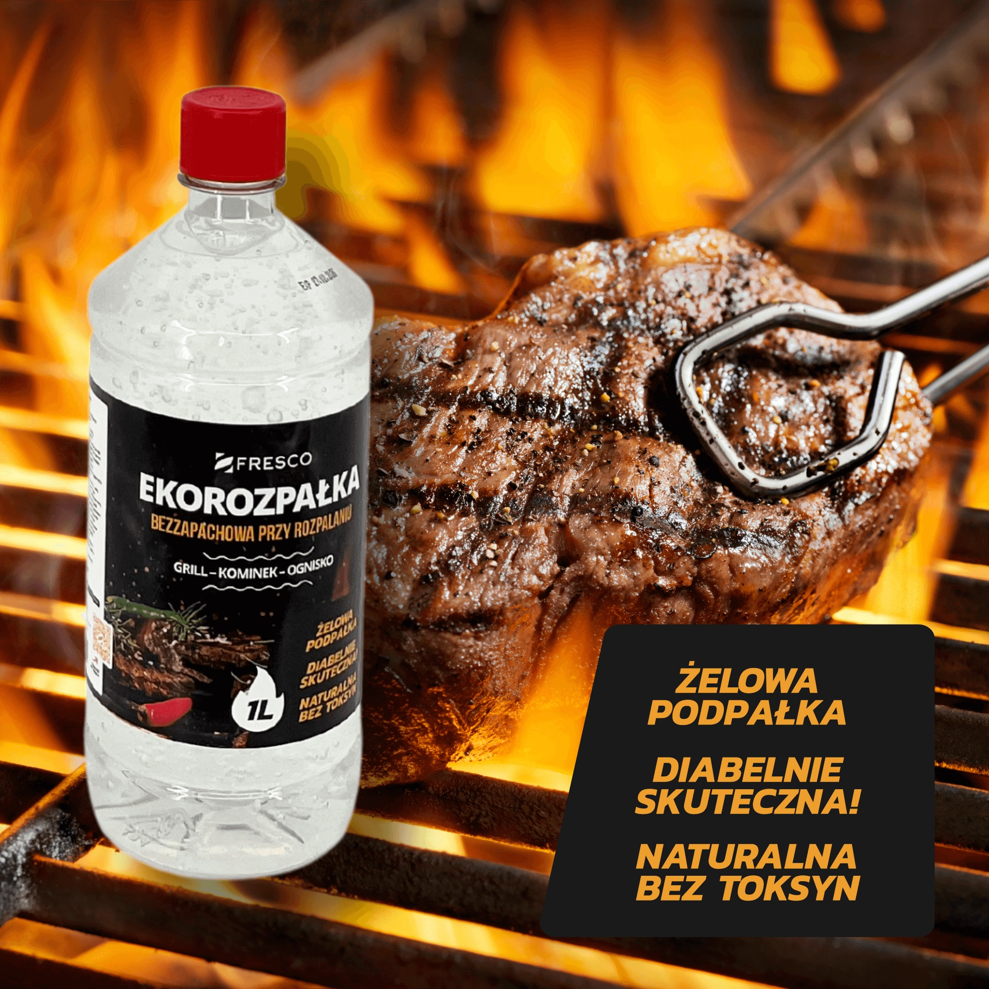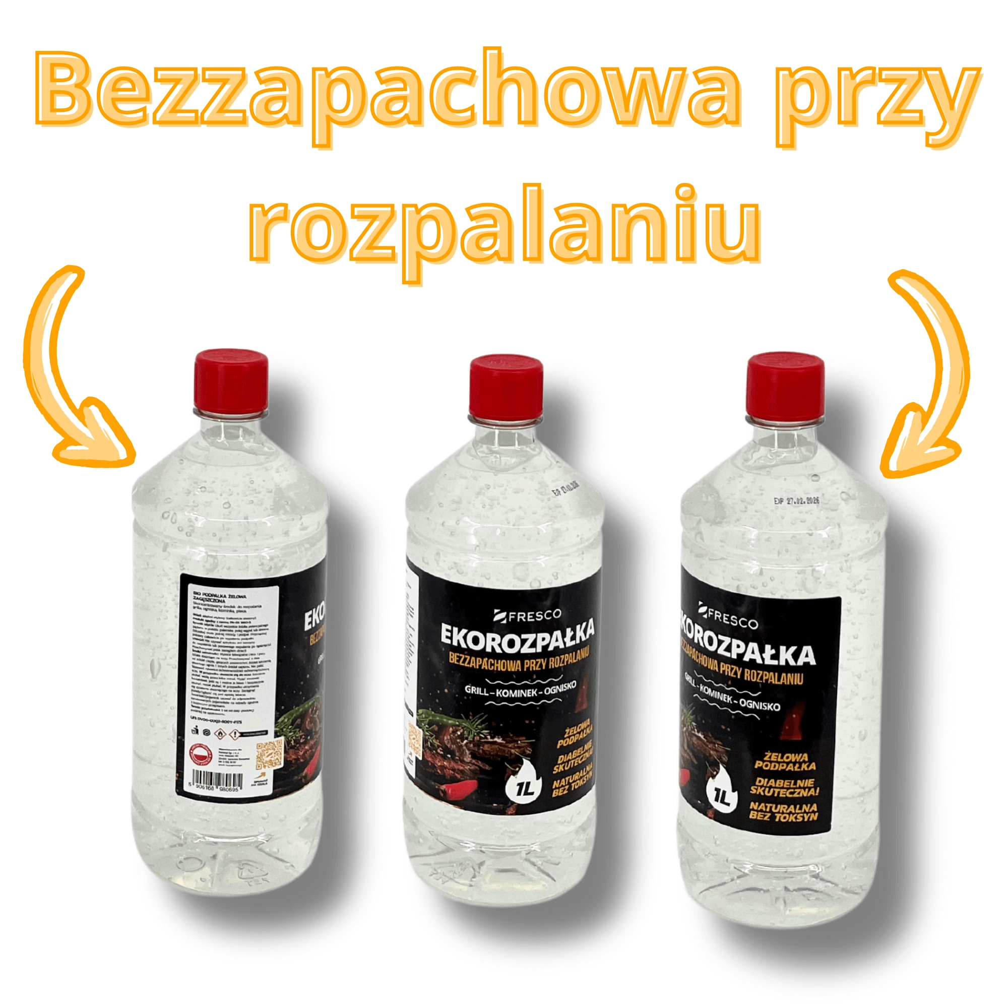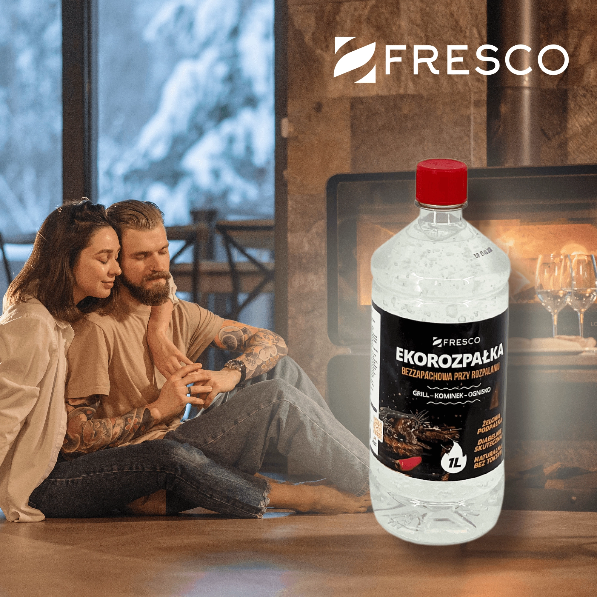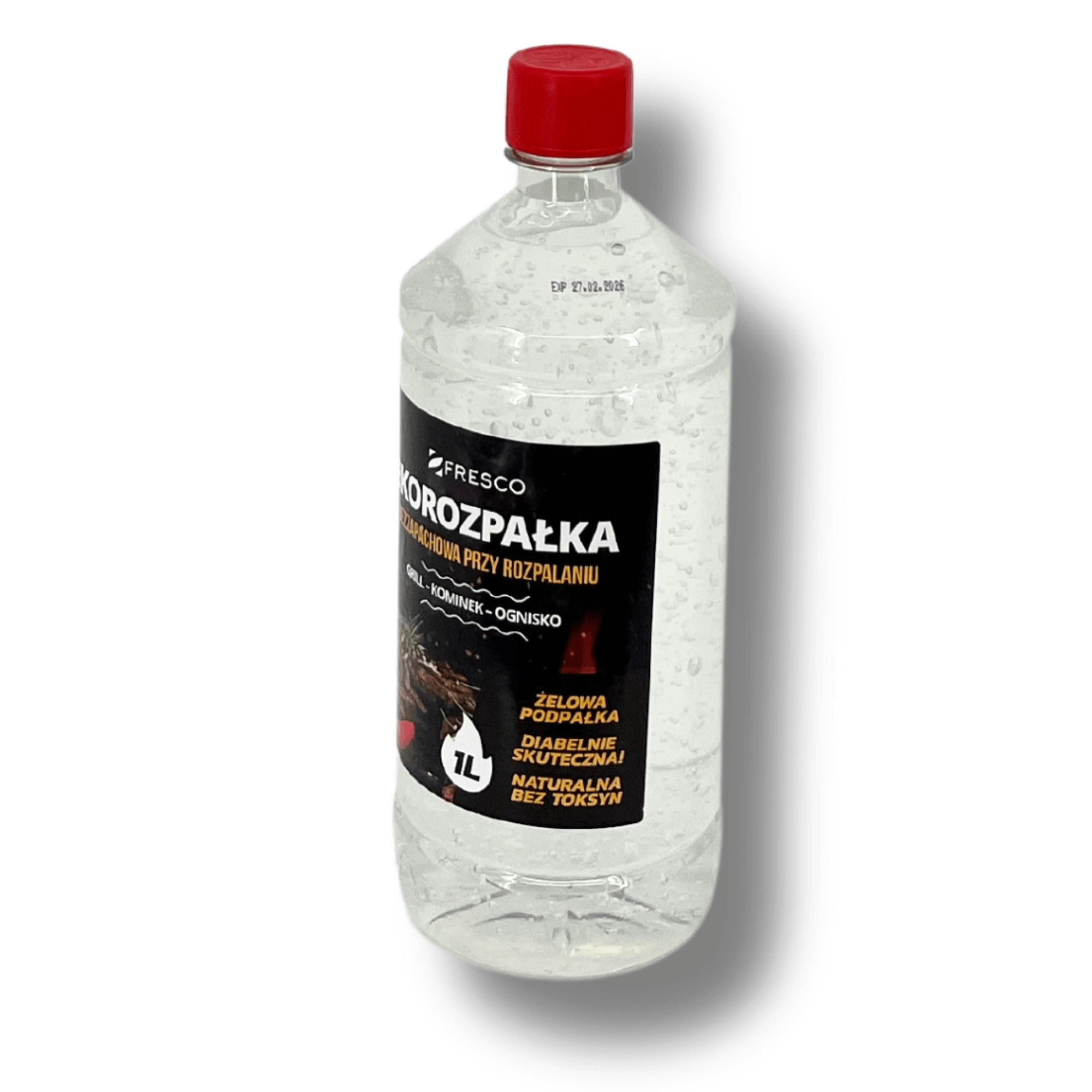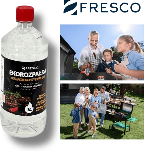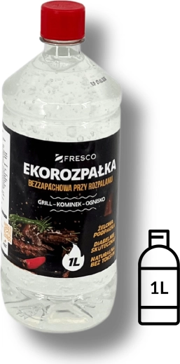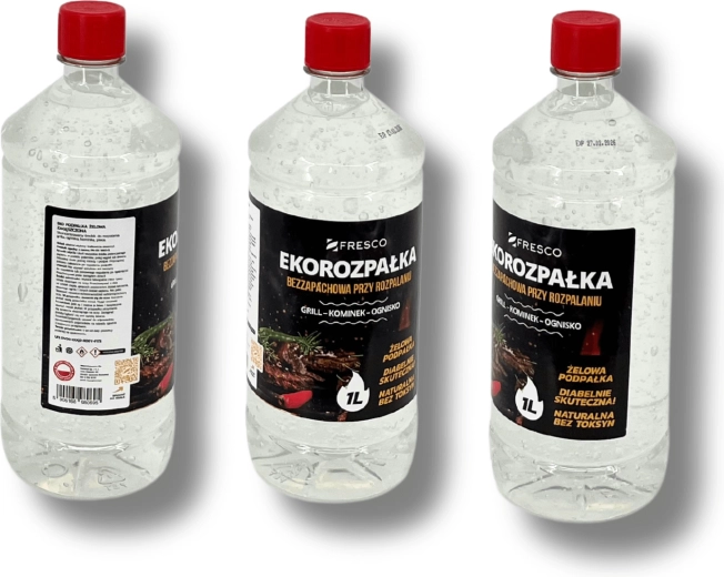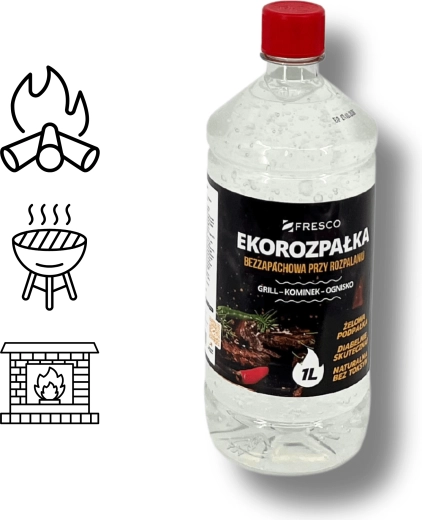Practical and safe FRESCO eco gel fire starter with a volume of 1 L for easy lighting of grills, fireplaces, and fire pits. It is completely odorless, free of toxic additives, and complies with PN‑EN 1860-3. Long shelf life of 5 years and a colorless gel consistency for convenient and effective use.