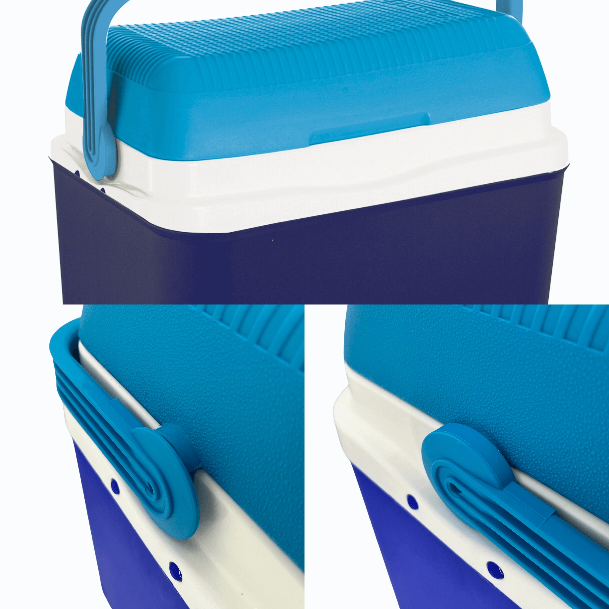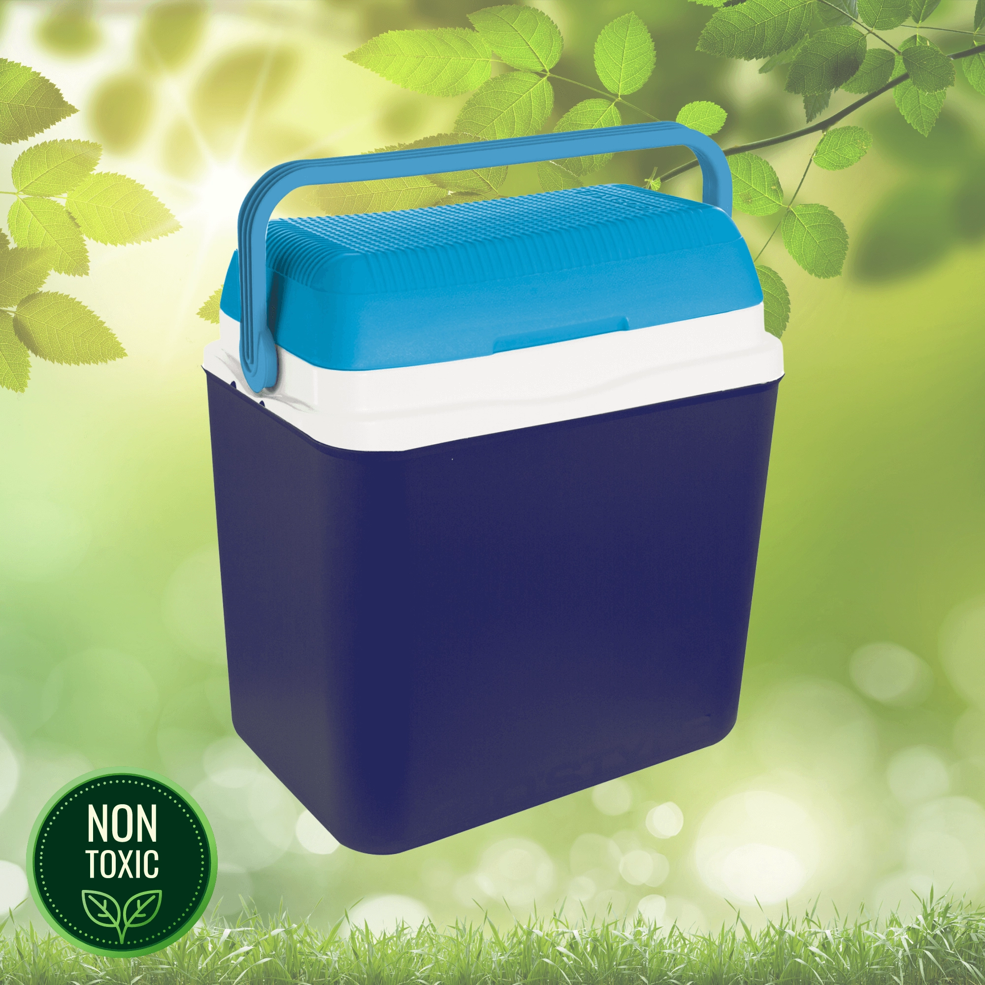 The compact shape fits easily into a car or caravan, and the sturdy, ergonomic folding handle ensures comfortable carrying. Durable polypropylene is easy to clean, and the lid with drink holders helps keep cups and bottles stable.