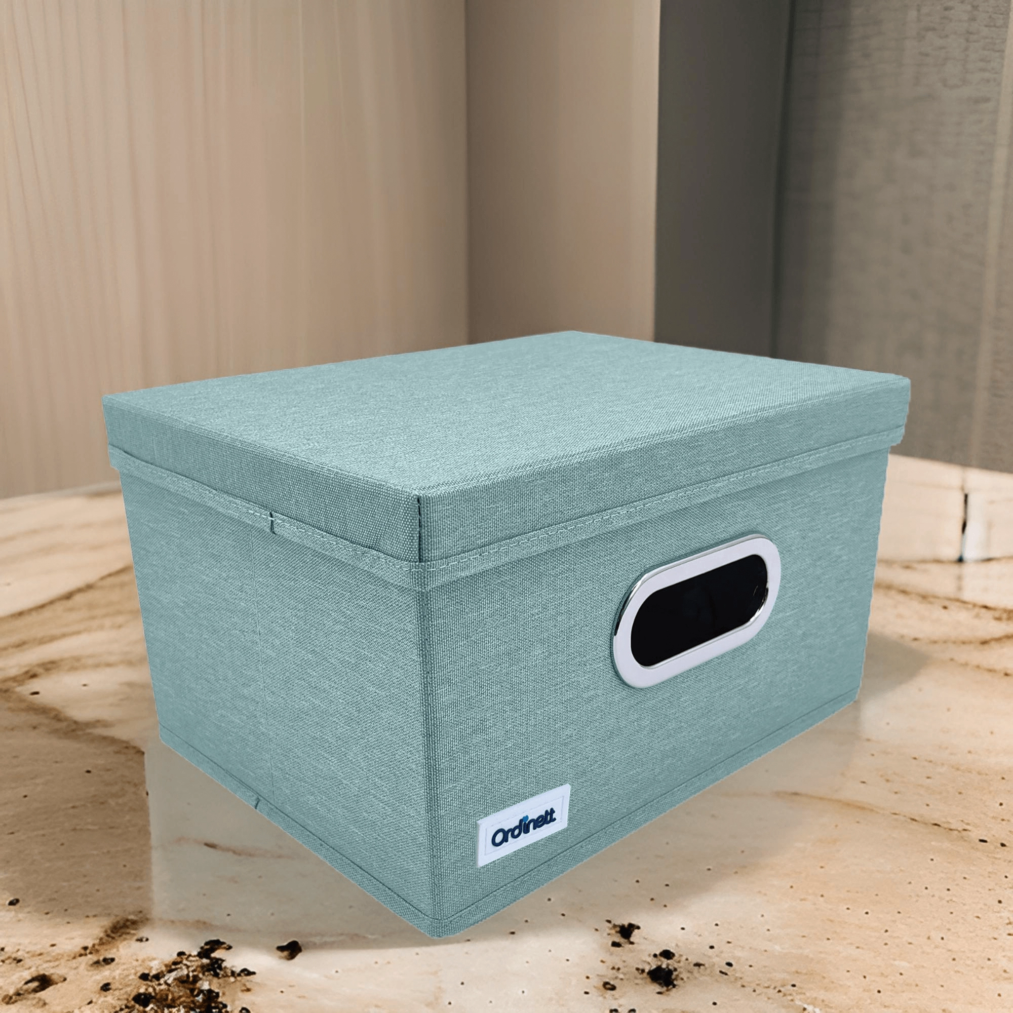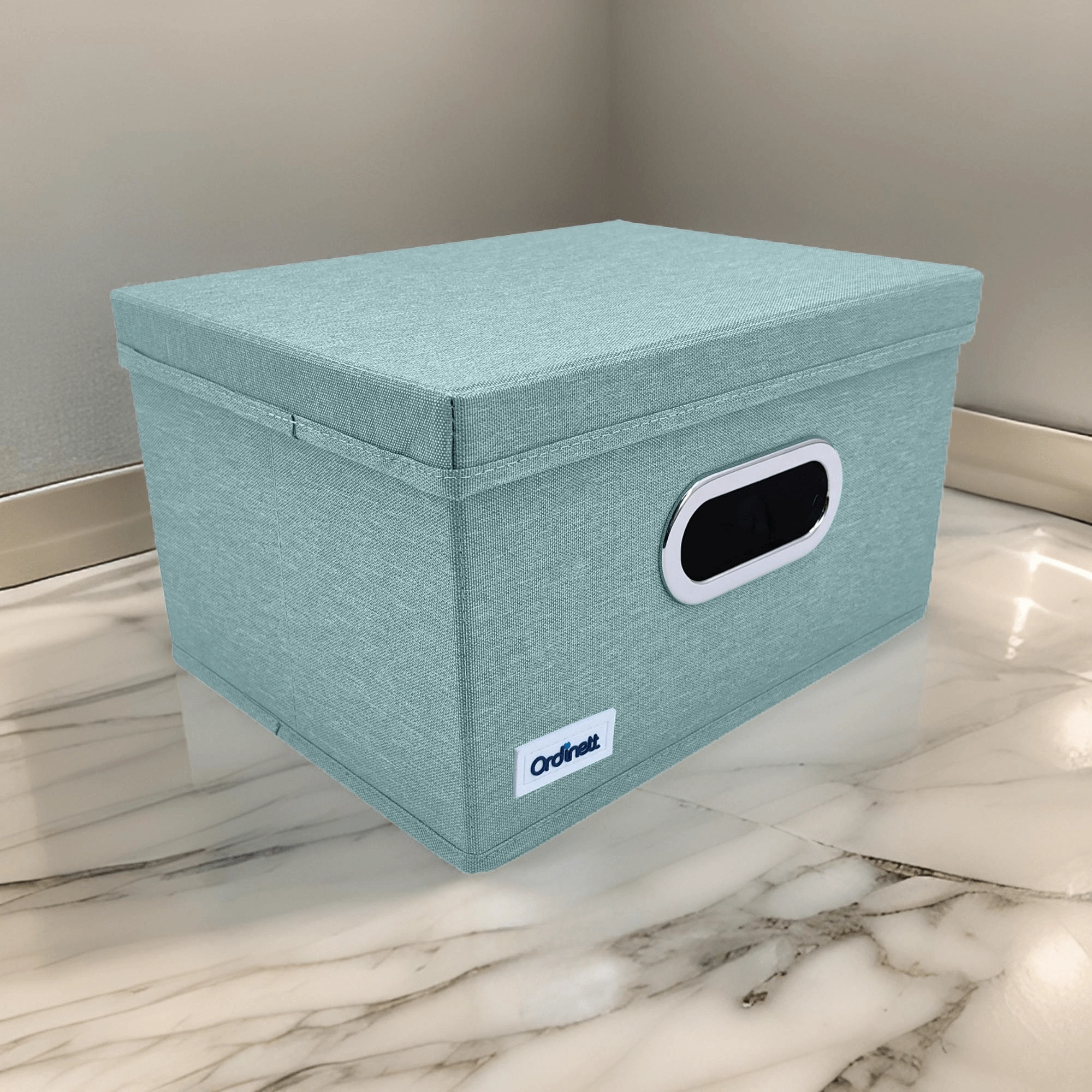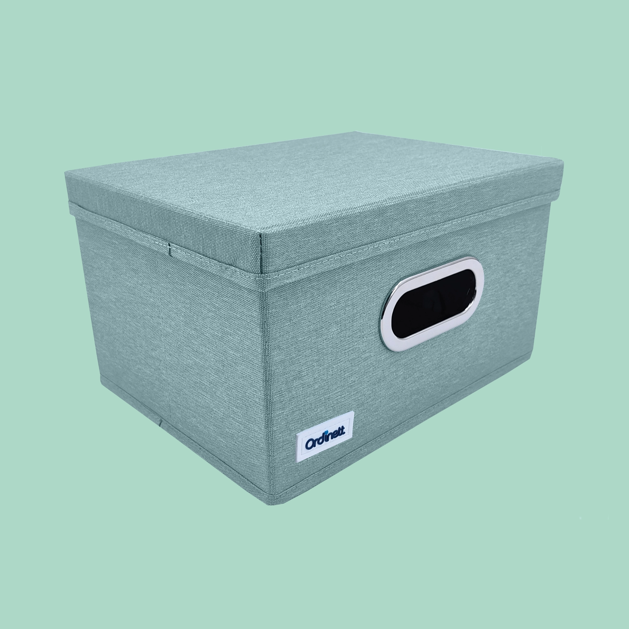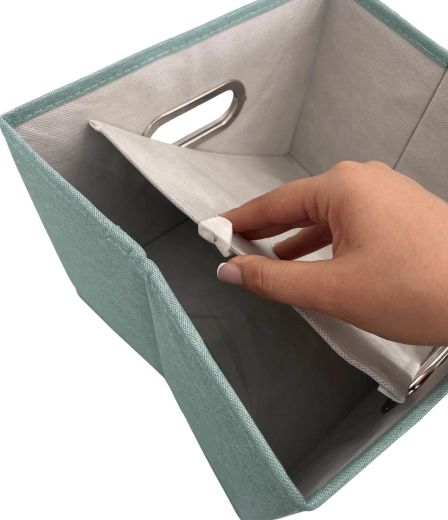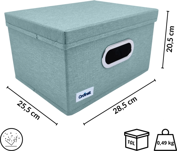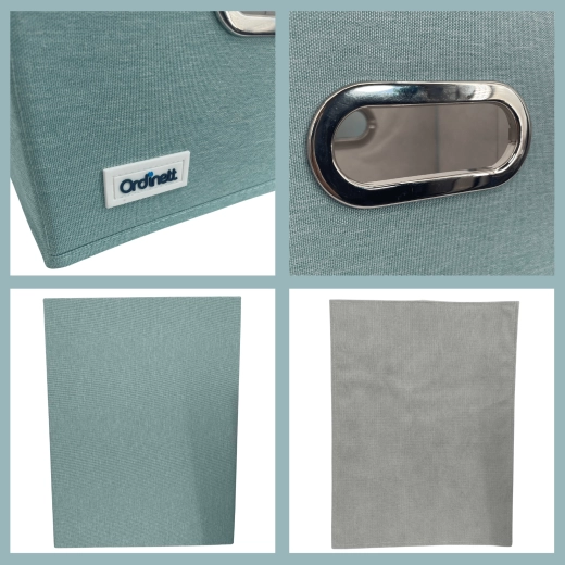 The fabric box with lid is ideal for neatly storing laundry, accessories, toys, or office supplies. The front oval window lets you quickly check the contents, while the lid keeps everything clean and concealed. The elegant mint color brings freshness and order to your interior.