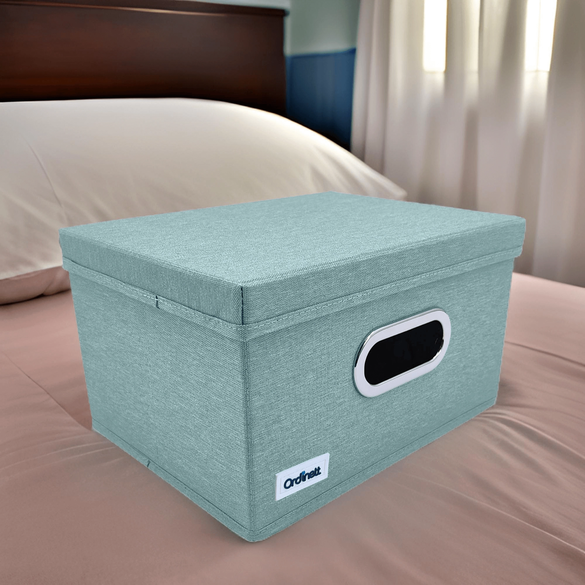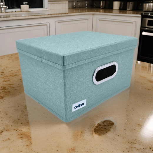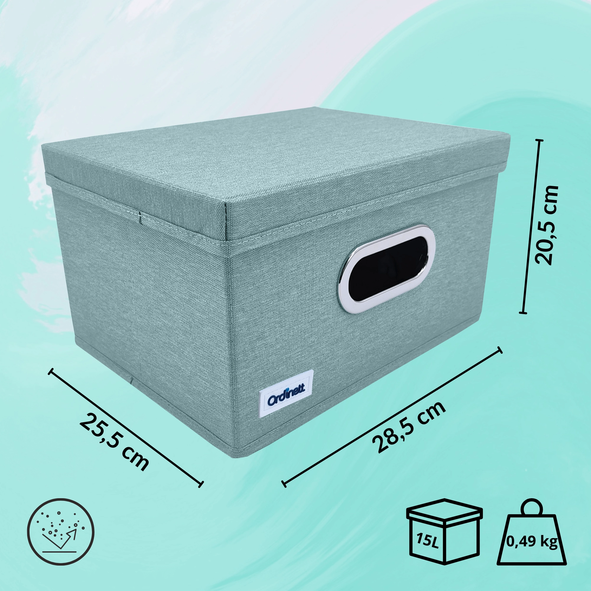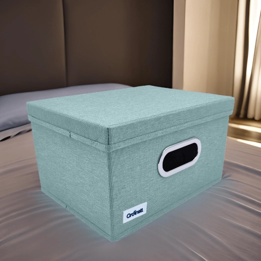 Keep your closet tidy with this stylish organizer in mint green. Thanks to the sturdy lid, practical window, and foldable design, it protects items from dust and saves space. Metal-reinforced handles make carrying easy, the rigid base holds its shape, and high-quality polyester ensures long-lasting use.