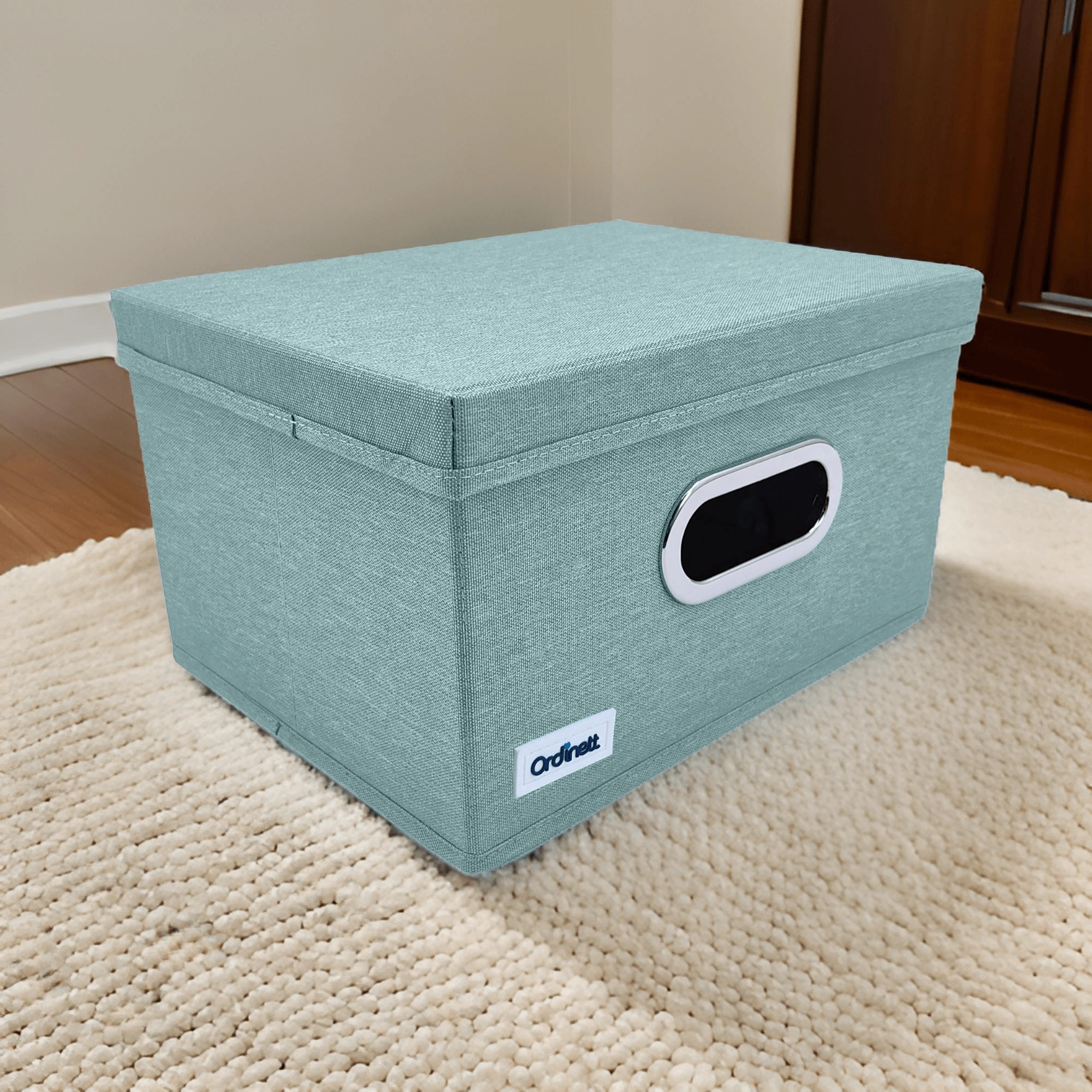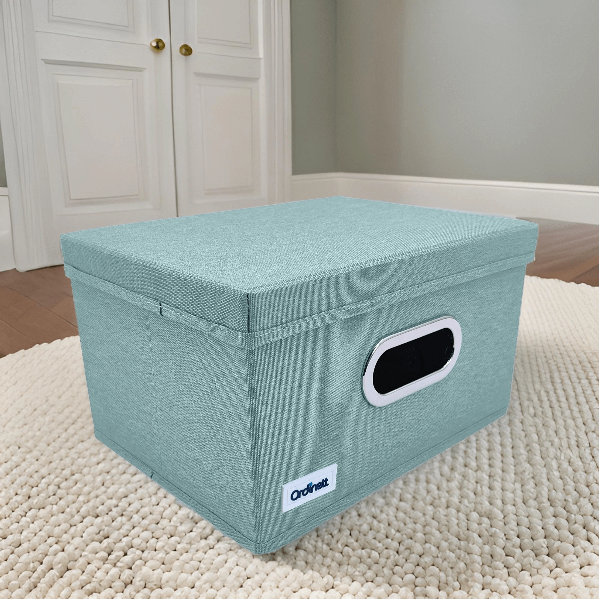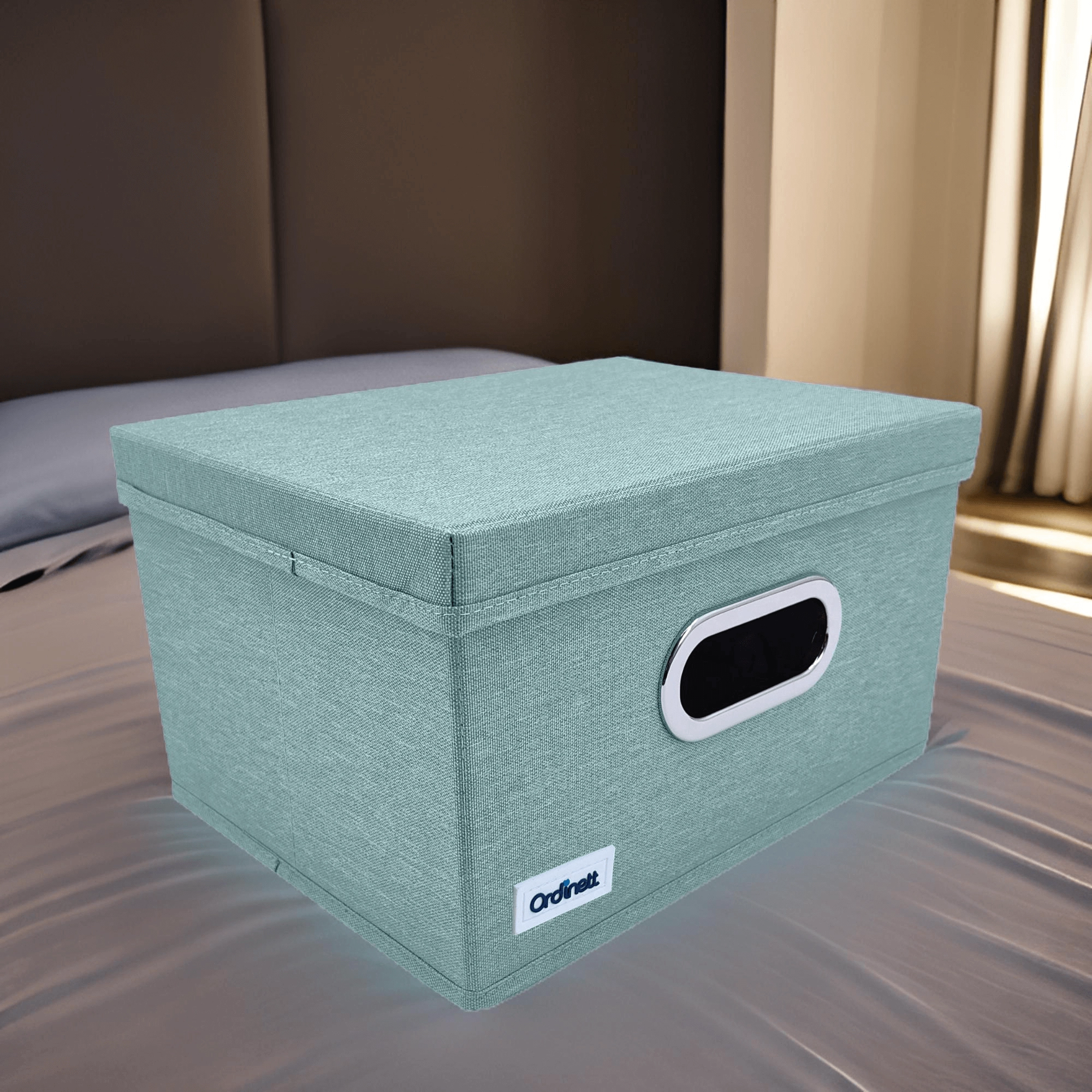 Keep your closet tidy with this stylish organizer in mint green. Thanks to the sturdy lid, practical window, and foldable design, it protects items from dust and saves space. Metal-reinforced handles make carrying easy, the rigid base holds its shape, and high-quality polyester ensures long-lasting use.