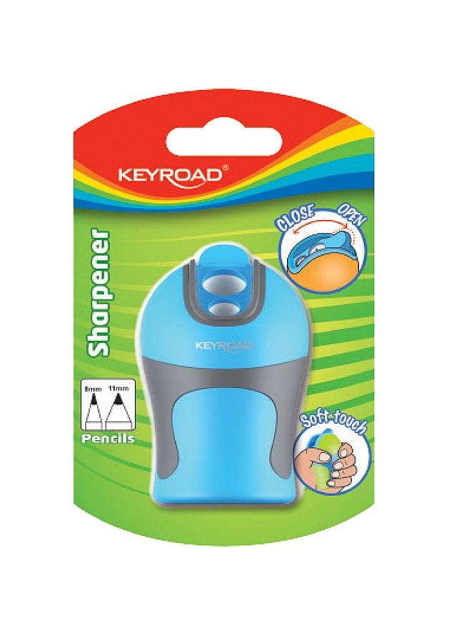 The KEYROAD sharpener is a reliable choice for school, office, and home. Thanks to its opening design and high-capacity shavings container, your workspace stays clean and sharpening is quick and mess-free. Two precisely ground holes with diameters of 8 mm and 11 mm handle both standard and thicker graphite pencils.