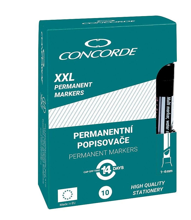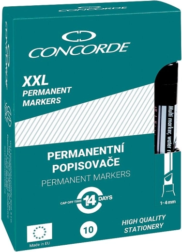 The universal CONCORDE permanent marker in green features opaque, waterproof, and indelible ink with an alcohol base. It writes excellently on glass, plastic, film, wood, and metal, and thanks to the 3 mm bullet tip, it produces a bold, legible line. It lasts for up to 14 days without a cap without drying out.