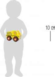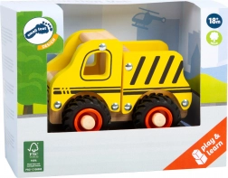A robust wooden construction vehicle made of 100% FSC wood with rubberized wheels for a quiet, smooth ride. Ideal for nurturing imagination and fine motor skills in children from 18 months, with compact dimensions and a durable build.
