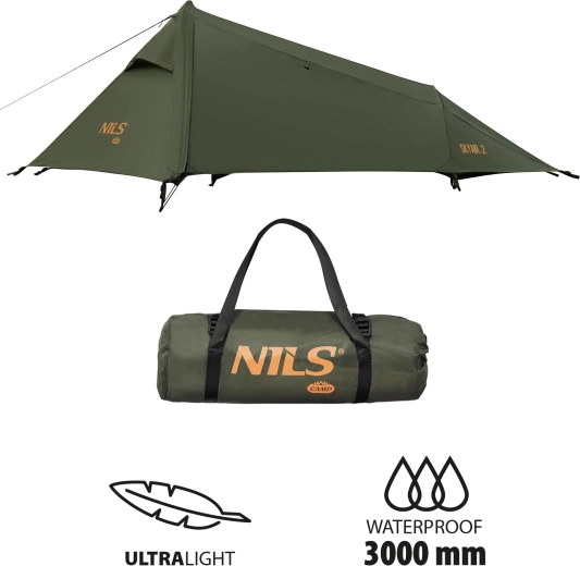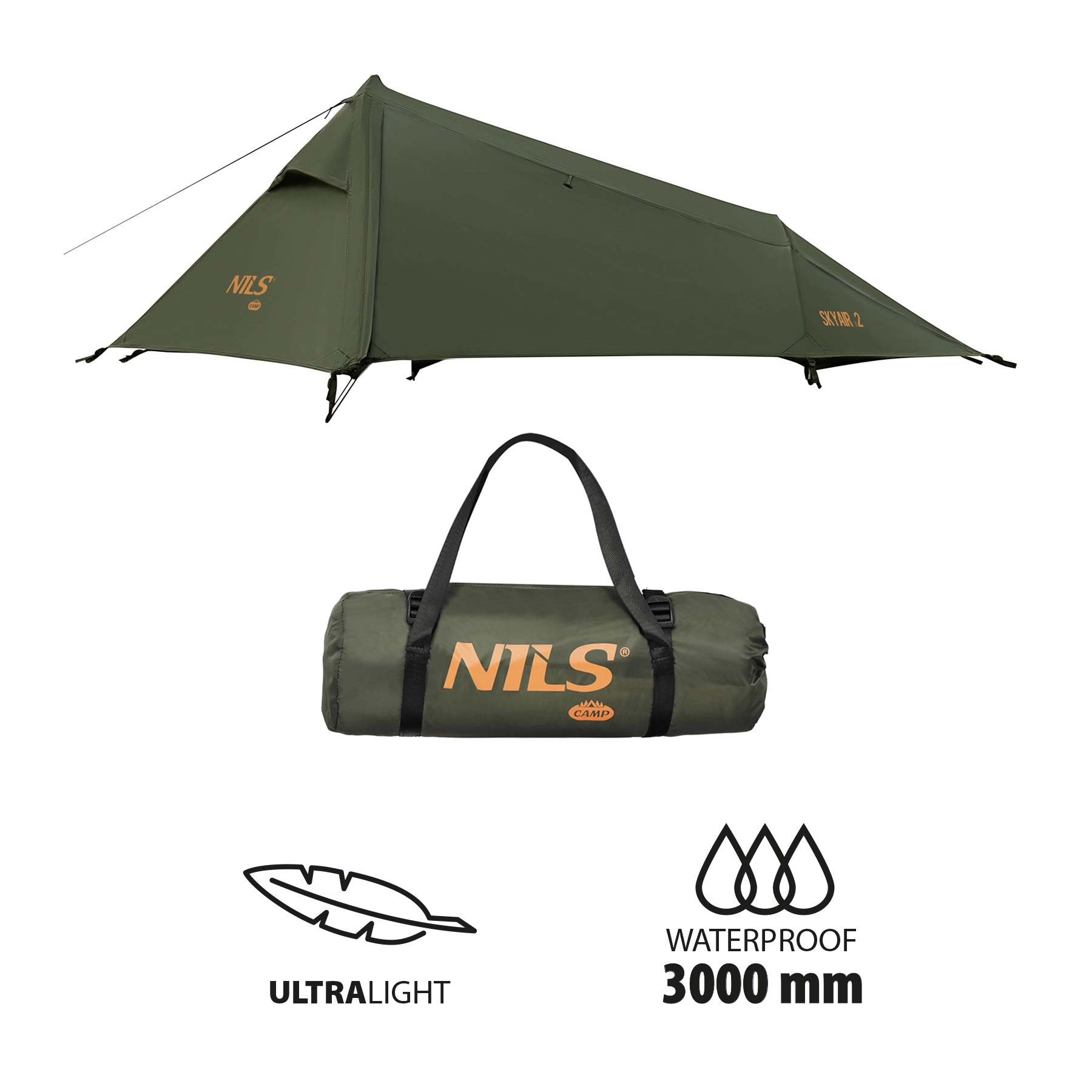 The ultralight two-person tent NILS Camp Skyair 2 is ideal for cycling trips, paddling adventures, and mountain hiking. It offers a minimal weight of 2.4 kg, compact packed dimensions, and reliable protection from rain and wind. Thanks to the flysheet with a 3000 mm water column, floor with 5000 mm, and no-see-um mosquito netting, it ensures a comfortable and restful sleep outdoors.