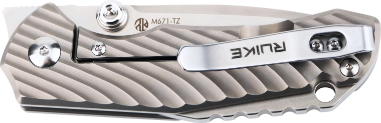 Compact EDC knife Ruike M671-TZ with a 7 cm blade made of 154CM steel and Bead Blasted finish offers smooth opening on ball bearings, a choice between a front flipper and a dual thumb stud, and secure frame lock. The lightweight TC4 titanium handle with texture, clip, and lanyard hole ensures comfortable and reliable everyday carry.