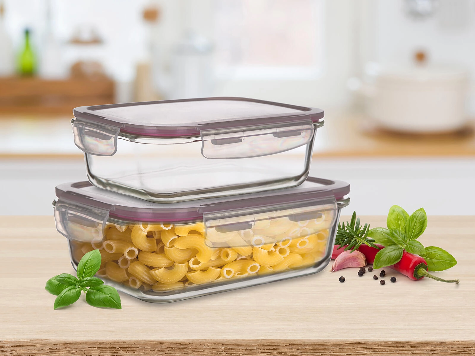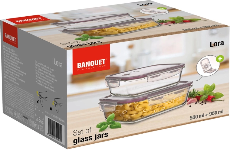 A practical set of two rectangular Lora glass containers with capacities of 0.55 l and 0.95 l, featuring polypropylene lids that provide airtight sealing, safe freshness preservation, and versatile use in the kitchen. Suitable for oven baking (without lid), microwave heating, freezing, and food transport. The lid is transparent with a burgundy gasket for reliable sealing.
