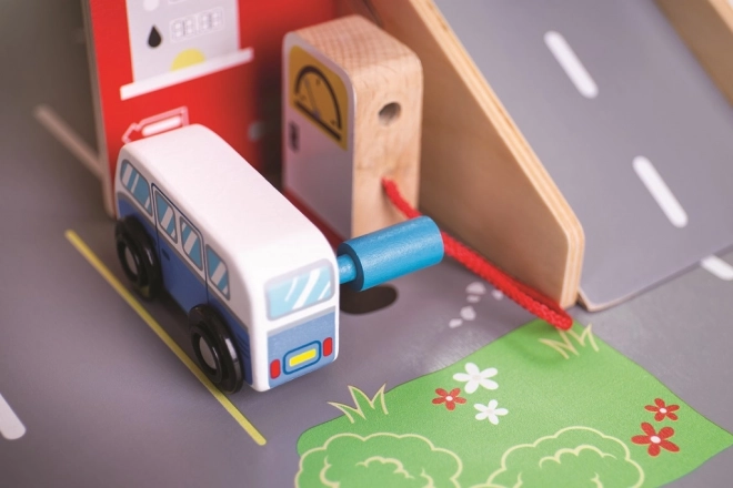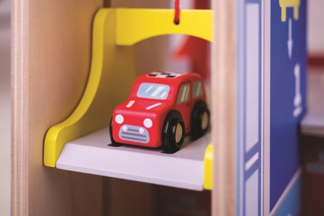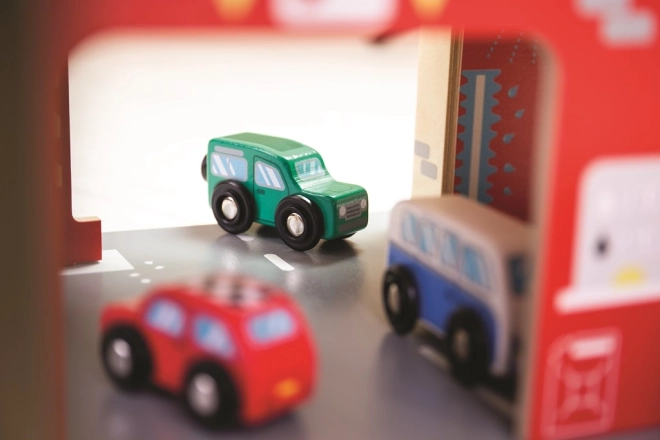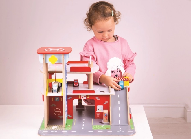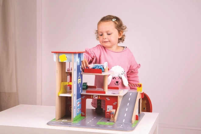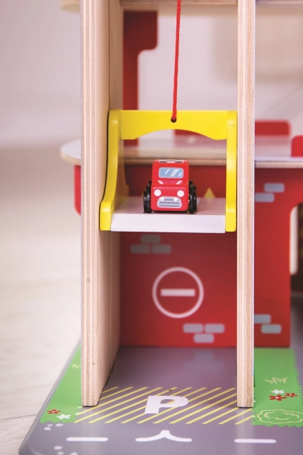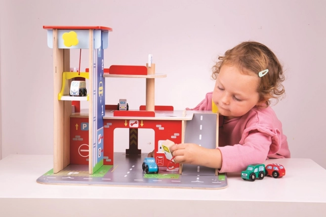 Children will enjoy fun play on each of the three floors of the garage with parking lot. On the ground floor, they can drive the car onto a working elevator and then ride up to the second floor to park. On the ground floor, children will find a service station, car wash, and gas pump. From the first floor, cars can depart using the elevator or the ramp—but watch out, cars must wait for the barrier to lift! The highest point of the garage is the helipad. This garage simply has everything a little driver needs to get from point A to point B. Encourages creativity and imagination. Develops hand-eye coordination, fine motor skills, and dexterity. Can be complemented with Bigjigs Toys cars and Bigjigs Rail. Made from high-quality materials from responsible sources. Main features: 3 floors with parking and helipad, functional elevator, service station, car wash, and gas pump on the ground floor.