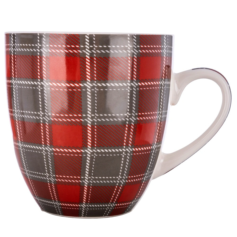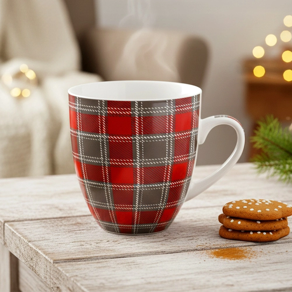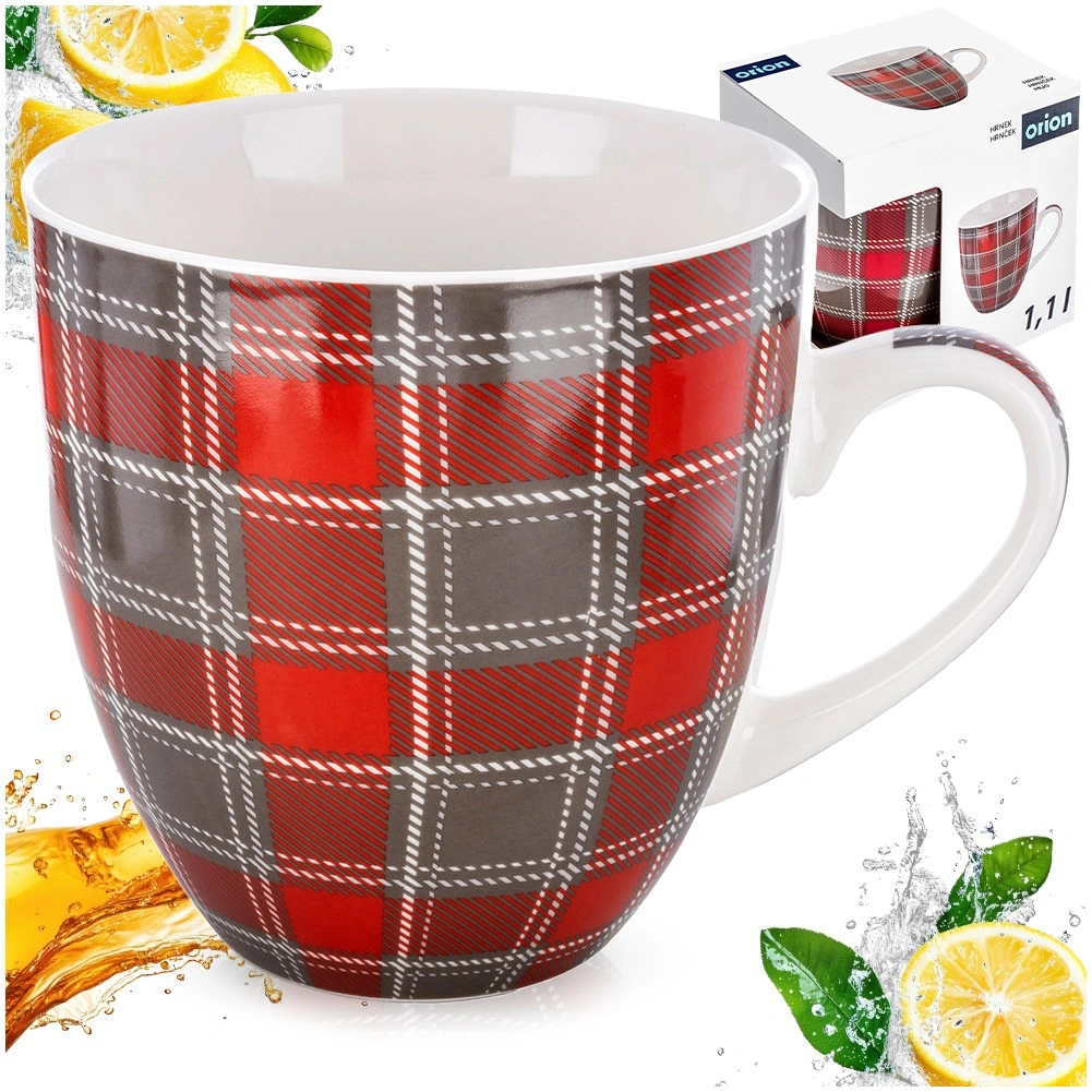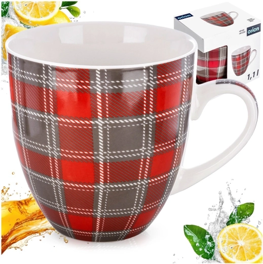 Large porcelain mug with a 1-liter capacity, comfortable handle, and a stylish checkered pattern in red–gray. Ideal for coffee, tea, and cocoa, dishwasher- and microwave-safe. High-quality porcelain ensures long service life and safe contact with food.