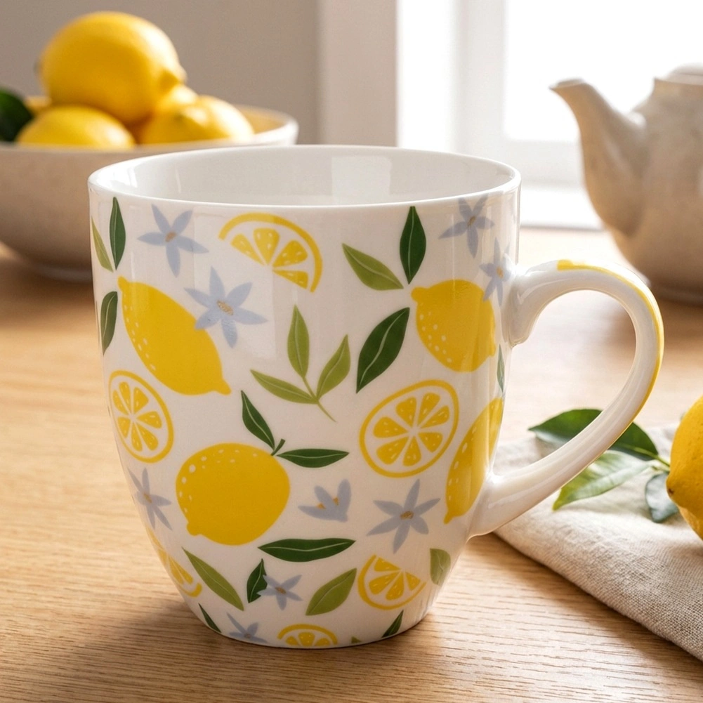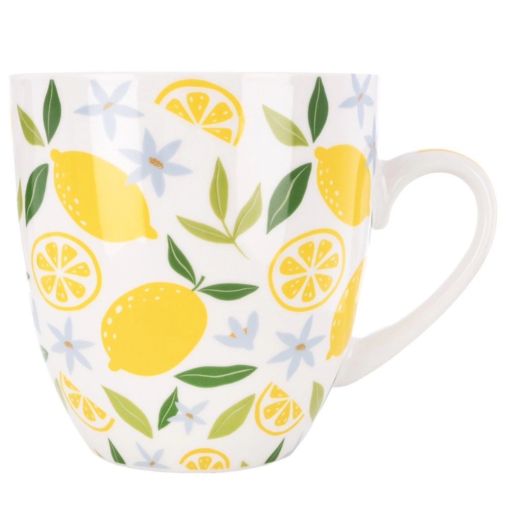 Enjoy your favorite drink in a large serving. This 1 L porcelain mug in white is adorned with a trendy lemon décor that lights up any table and brings lightness and good mood to your interior. Thanks to the ergonomic handle, it sits comfortably in the hand even when full.