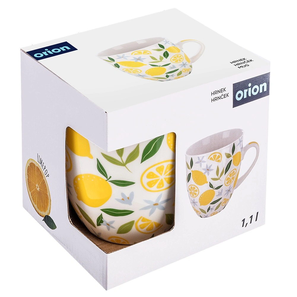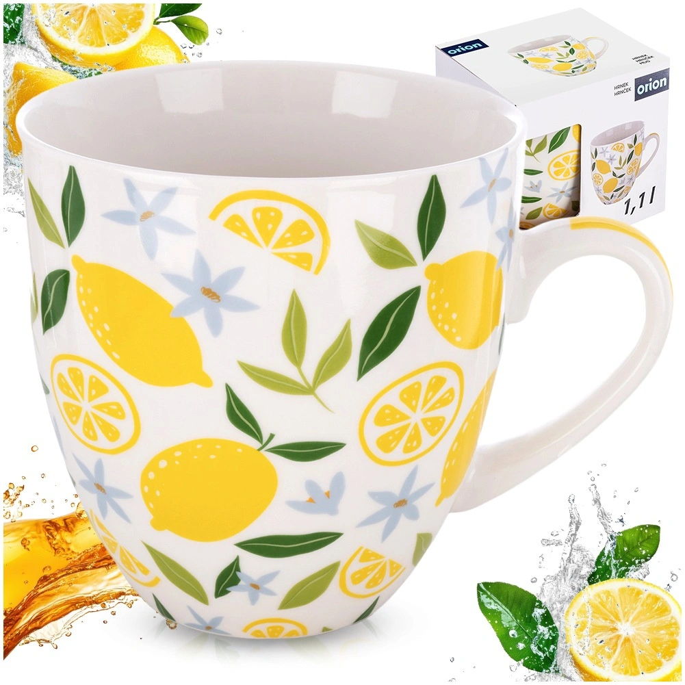 Large XXL porcelain mug with 1 L capacity featuring a cheerful lemon motif, ideal for coffee, tea, cocoa, and cold drinks. It has a comfortable handle, is dishwasher- and microwave-safe, and thanks to its quality porcelain glaze offers long service life and safe contact with food.