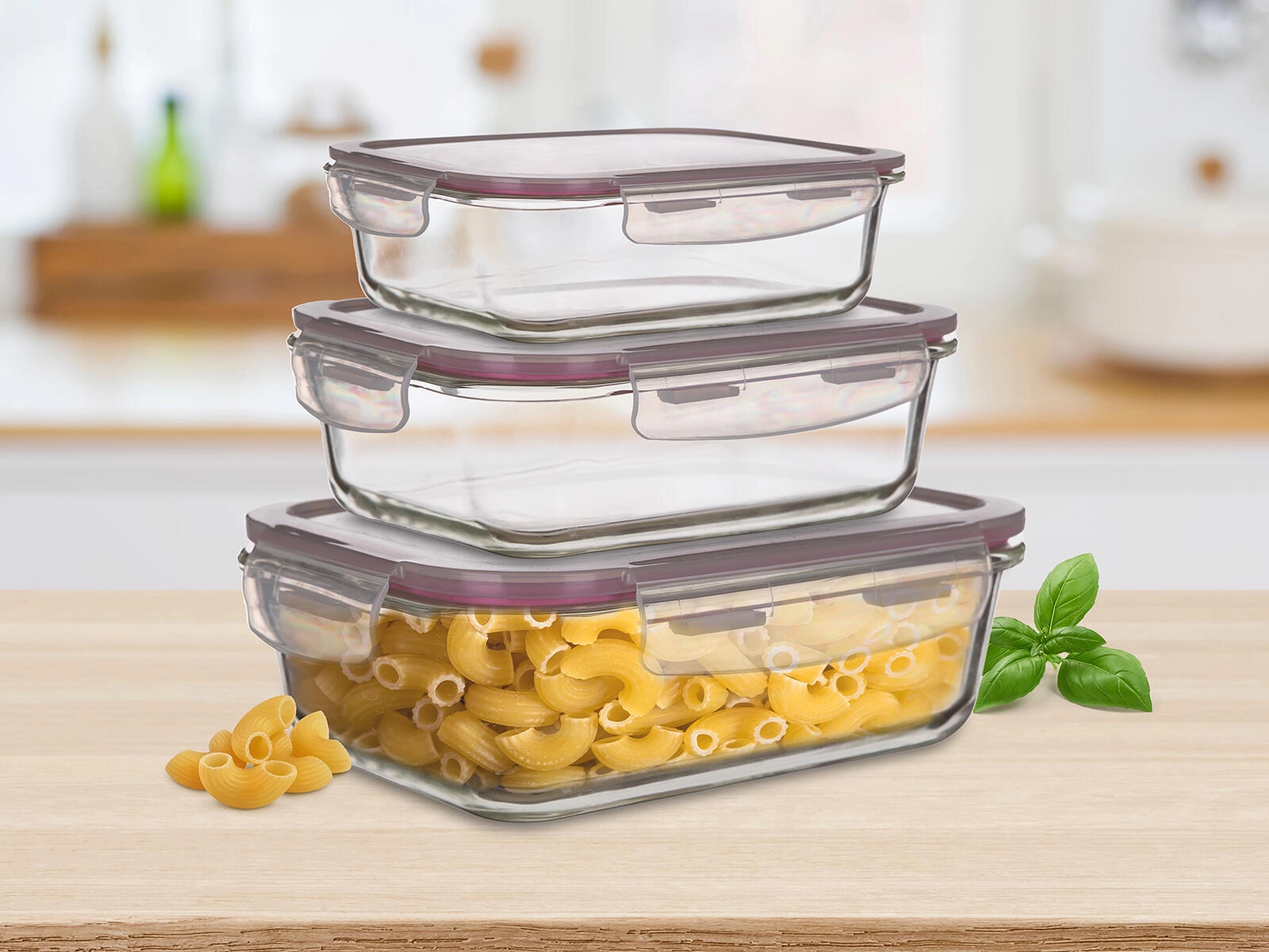 A practical set of three rectangular Lora glass containers with transparent PP lids and burgundy seals keeps your food fresh for longer. The containers are airtight, suitable for the freezer, microwave, and for the oven without the lid. Ideal for storing, transporting, and reheating meals.
