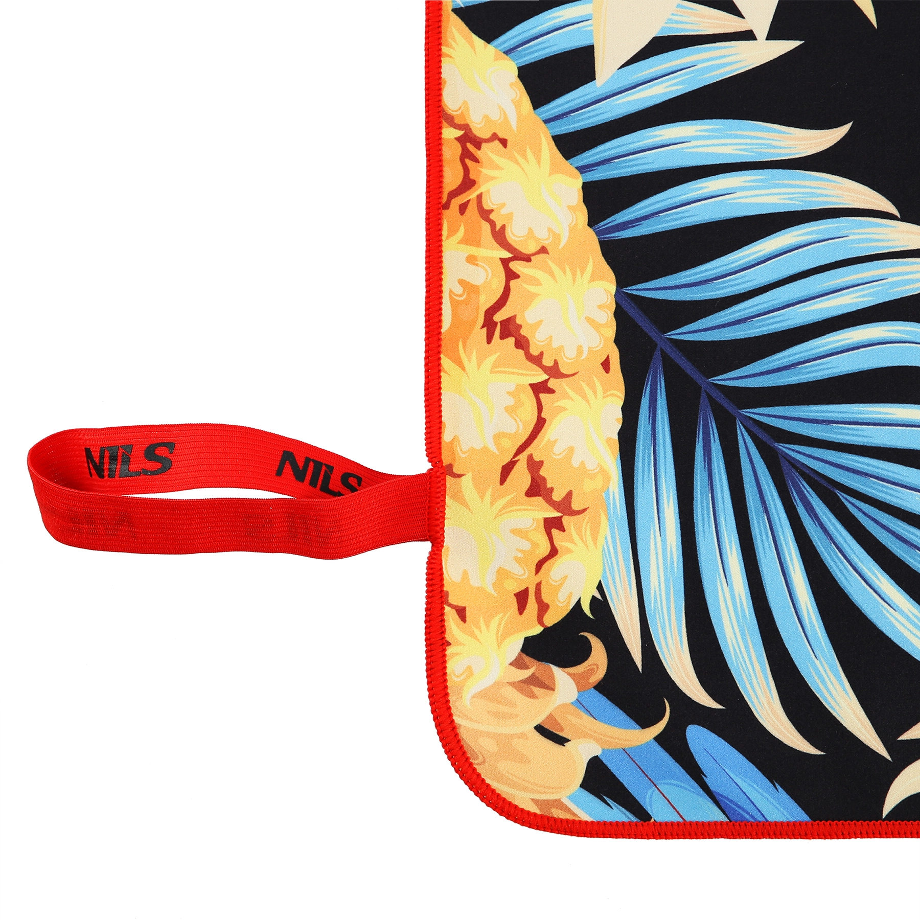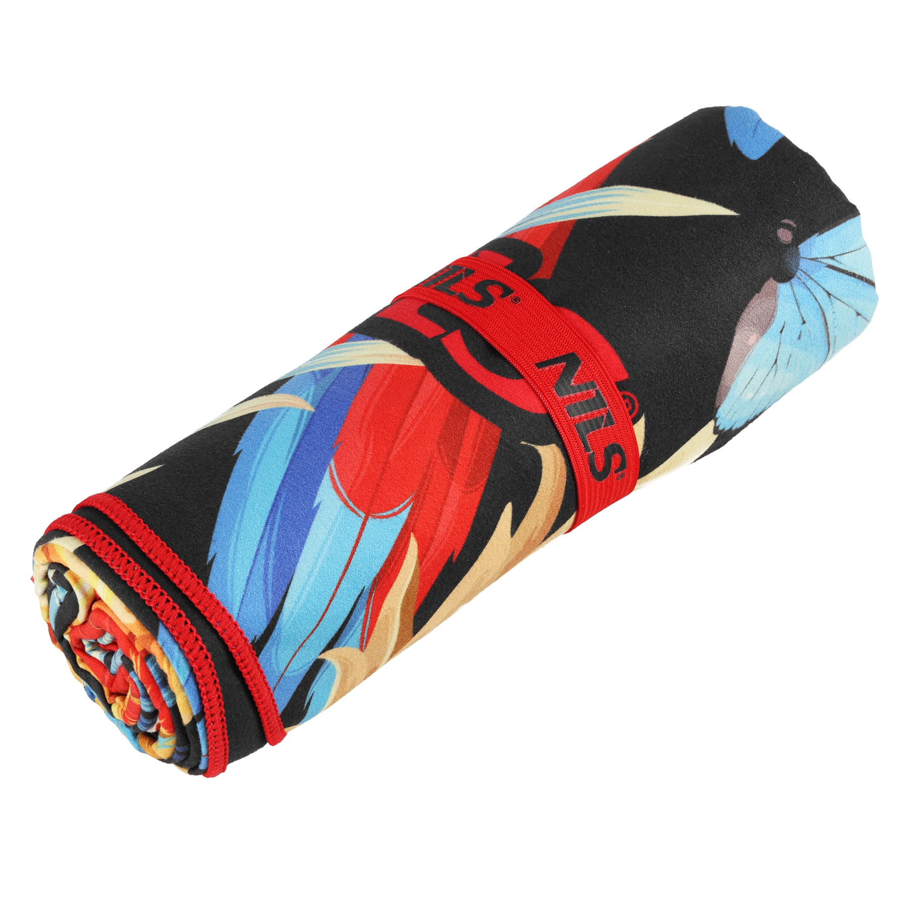 The lightweight, compact NILS Camp microfiber towel features quick-drying and super-absorbent material that effectively wicks away water, making it ideal for travel, sports, and the beach. Thanks to its porous structure, it dries within minutes, includes a practical elastic strap for securing, and has durable anti-fray stitching for long-lasting use.