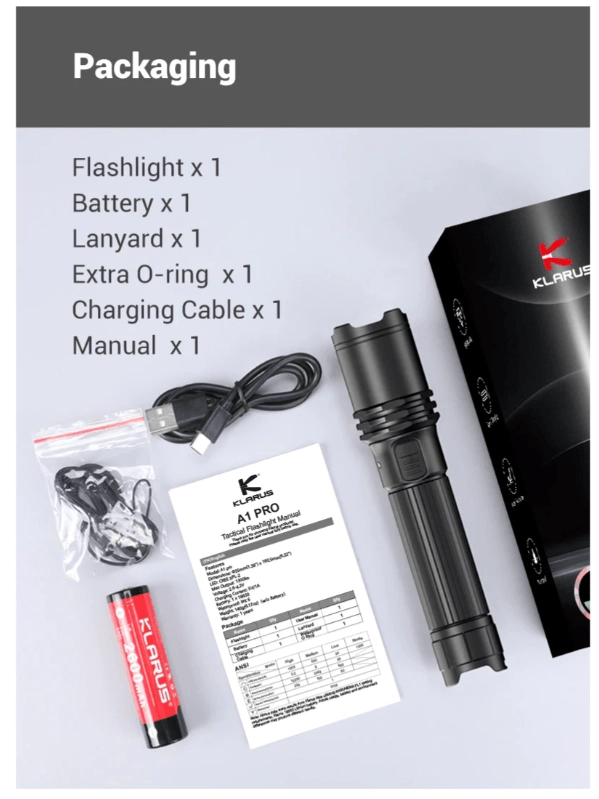 Compact, powerful, and reliable. The Klarus A1 Pro tactical flashlight delivers up to 1300 lumens of daylight white light with a reach of 230 meters. The robust aircraft‑grade aluminum body stands up to duty, outdoor, and home use, while the dual side switches allow confident control even with gloves.