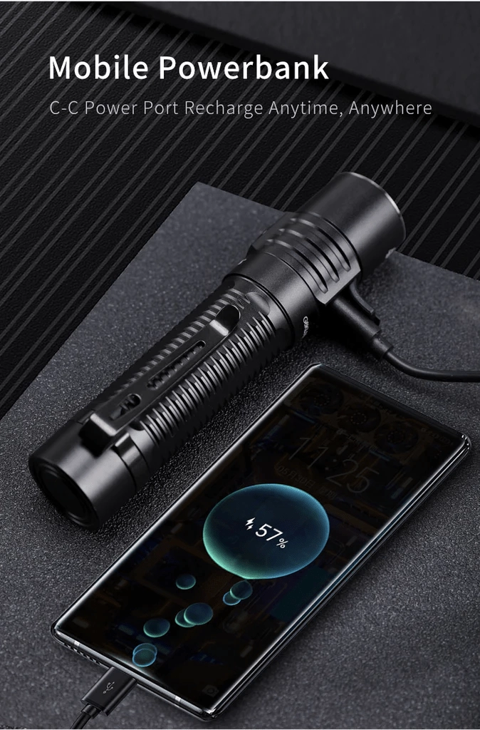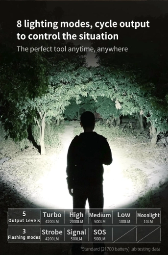 The maximum output of 4200 lumens from a quality CREE XHP70.2 LED provides a wide, powerful beam with a reach of up to 200 meters. Built‑in USB‑C (2 A) charging allows you to conveniently recharge the included 21700 5000 mAh Li‑ion battery directly in the flashlight, with runtime up to 200 hours in the most economical mode.