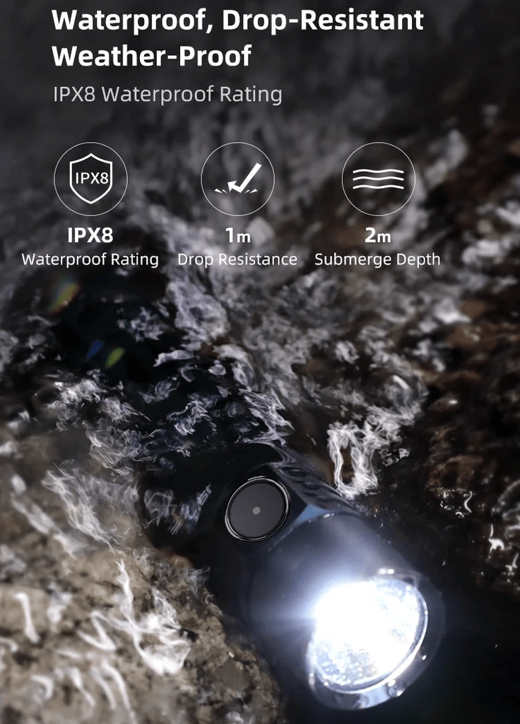 IPX8 waterproof, dust‑resistant, impact resistance up to 1 m