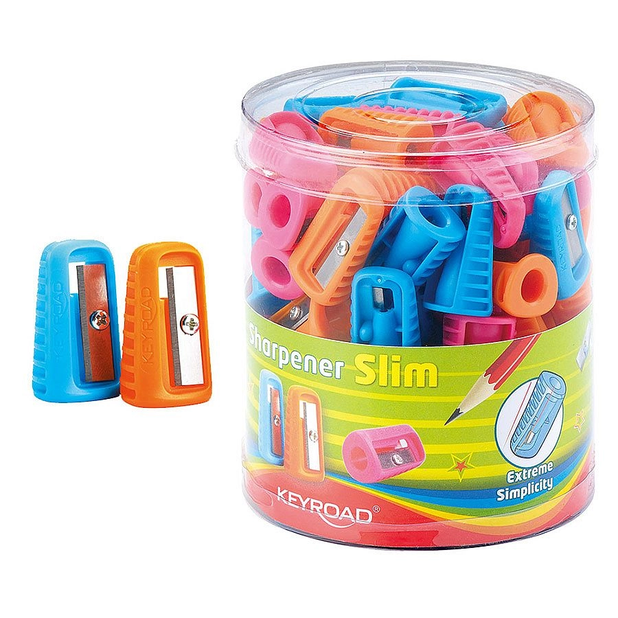 The compact KEYROAD Slim plastic sharpener is ideal for pencil cases and travel bags. It offers a slim design, single-pencil sharpening, a non-slip grip for comfortable handling, and comes in a mix of three colors.