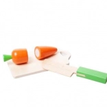 This wooden fruit and vegetable cutting set lets children enjoy realistic play in the kitchen, shop, or home. The pieces are connected with hook-and-loop, so children can safely cut them with the included knife and then join them back together. Thanks to vivid colors and the pleasant wooden feel, children practice fine motor skills, hand–eye coordination, and expand their vocabulary.