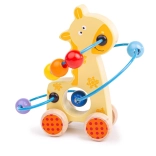 Colorful wooden toy in the shape of a giraffe on wheels with a metal bead maze for developing fine motor skills and coordination in children. Suitable for every child thanks to high-quality materials.