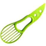 Discover an easy way to prepare an avocado in seconds. This multifunctional helper combines a sharp plastic knife for lengthwise cutting, a special section for safe pit removal, and a practical side for quick scooping and slicing the flesh into segments.