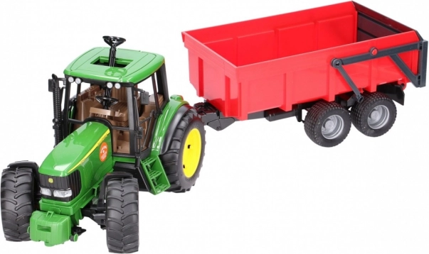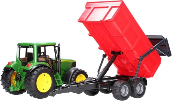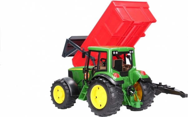 Realistic set for young farmers: the green JOHN DEERE tractor with a tipping trailer offers plenty of functions for action-packed play. Features include an opening engine hood, steering via an extended steering wheel through the roof, and treaded tires. The trailer has an automatic rear tailgate for easy unloading. High-quality German craftsmanship made of durable plastic, scale 1:16.