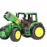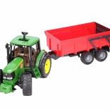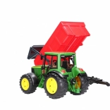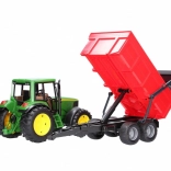 The JOHN DEERE tractor set with a functional tipping trailer gives kids a realistic farming experience. The tractor features detailed workmanship, an opening hood, a steerable front axle via the extended steering wheel in the cab, and pronounced treaded tires for an authentic look and tracks.