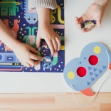 After completing the picture, little detectives can start their search: can they find 5 sweets, 4 wheeled objects, 3 headwear items, 2 musical objects, and 1 stinky thing? Thanks to high-quality materials from FSC-certified paper and printing with non-toxic inks, the game is safe and kind to nature.
