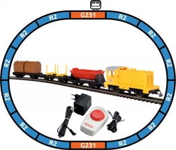 - DB diesel locomotive (1×), DB freight cars (3×), R2 curves 55212 (12×), straights G231 55201 (2×), power clip 55270 (1×), analog controller with power supply 55003 (1×)