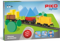 Discover the world of model railroading with the PIKO myTrain starter set in H0 scale. A robust, colorful yet detailed consist with a locomotive and three cars offers easy analog control, H0 (DC) compatibility, and a complete basic oval of track including power supply and controller. Ideal for children from 8 years and beginning modelers.