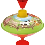 Colorful spinning top with a farm theme will become your children's favorite toy. Just pull up and press the lever, the top will start to spin and make a typical sound.