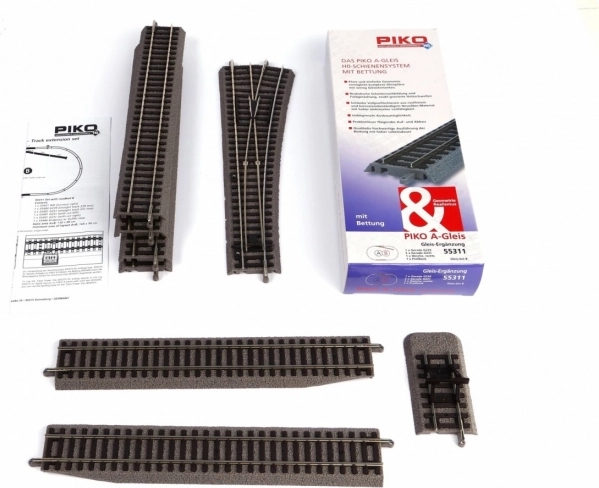 This PIKO H0 track set features realistic wooden sleepers on a gravel ballast in authentic colors. With the right-hand simple turnout to a dead-end track, you can easily create a siding for locomotives or train sets. The turnout can be operated manually and is prepared for adding a remotely controlled switch motor (available separately), including a ready-made connection.