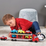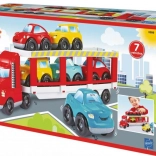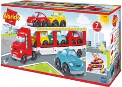 Attractive Abrick transporter for carrying toy cars! The transporter is equipped with a folding ramp that allows easy loading and unloading of six colorful cars.