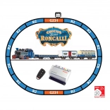 This complete train set includes everything for immediate running: steam locomotive, passenger coach, covered and open freight wagons, oval of track with roadbed, and power supply with wireless analog controller. The train in the attractive RONCALLI livery delights with realistic looks and reliable performance.