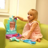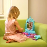 This stylish vanity set in a turquoise–purple color combination brings children hours of creative fun. The centerpiece is a mirror with light and sound effects – when activated it plays melodies that enhance the atmosphere while playing hairdresser or beauty salon.