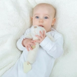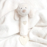 This versatile soft dog toy offers three experiences in one: gentle rattling to stimulate hearing, a fun squeak when pressed, and a textured teether for relief from emerging teeth. The neutral natural tone suits any baby kit.