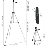 The tripod is ideal for photography and videography using a camera, phone, or digital camcorder. It features a universal 1/4" thread and a compatible holder for various devices. This practical and lightweight accessory is easily portable, making it an ideal travel companion.