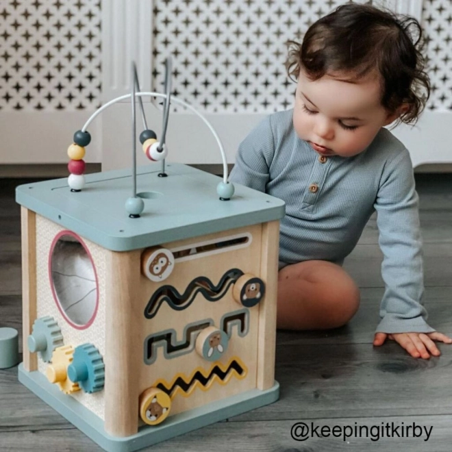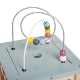 Discover a versatile motor activity cube made from high-quality 100% FSC wood that will keep kids entertained for hours. Each side offers a different activity – a shape sorter, bead/ball run, gears, and more. The combination of natural wood and soft pastel colors is ideal for boys and girls alike. This toy supports the development of motor skills, communication, and number recognition and is safe for children thanks to eco-friendly materials certified by the FSC.