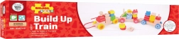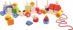 Three coupled carriages and 28 stacking blocks offer dozens of combinations. Children practice color and shape sorting, fine motor skills, and imagination.