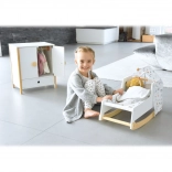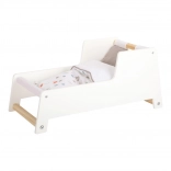 Included are reversible, neutrally toned bedding and a large blanket under which dolls or plush toys up to 46 cm fit comfortably. The soft colors and minimalist lines make it a tasteful addition to any interior and support creative and pretend play.