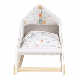 A stylish Nordic-style doll cradle for children aged 3+. It features a stable wooden frame, rocker runners, an easily removable canopy, and reversible gender-neutral bedding. Under the large blanket, dolls and plush toys up to 46 cm can sleep comfortably. Elegant pastel tones and rounded edges fit perfectly into a modern kids’ room.