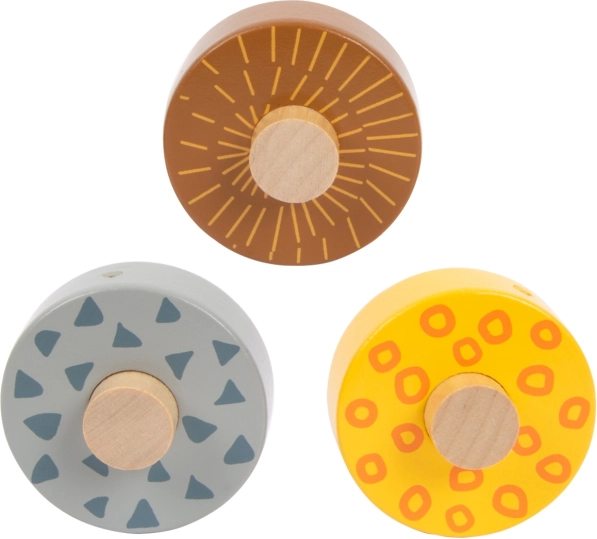 This beautiful wooden track offers children the opportunity to watch as three wheels, each with a unique design, roll down the three ramps. It is decorated with illustrations of animals living on safari and plants from the jungle.