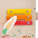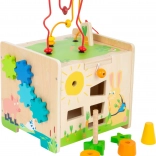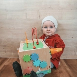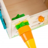 Children will discover a rich range of activities: shape sorting, turning colorful gears, sliding elements in a maze, playing the xylophone, and a fun carrot – a screw-on stacking piece that develops grip and patience. The robust wooden construction and soft colors with animal illustrations captivate at first sight.