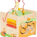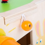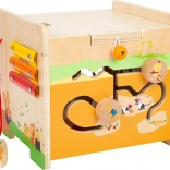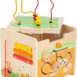 This high-quality wooden activity cube featuring a bunny and friends encourages exploration, trains hand–eye coordination, and supports early musical perception thanks to the built-in xylophone. The top section with the bead maze can be easily removed and flipped to save space, or used practically as a stool.