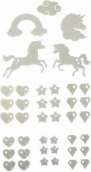 Brighten up a child's room with a set of glow-in-the-dark decorations featuring a unicorn and other designs. After a brief exposure to light, they glow in the dark and easily attach to walls, ceilings, and furniture. The pack includes 41 pcs and adhesive putty for easy installation.