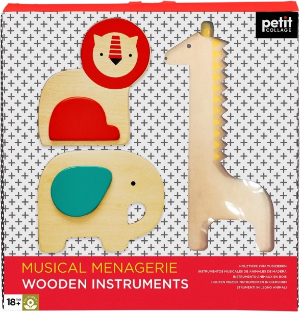 A cute set of wooden musical instruments for little ones that supports rhythm, listening, and fine motor skills. It includes a giraffe guiro and two maracas (elephant and lion). Made from FSC wood, printed with water-based paints, and delivered in recyclable packaging; safe for 18 months+.