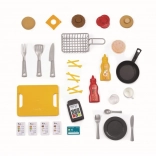 29 pcs: pan, cutting board, plate, cutlery, glass, mug, basket, kitchen utensils, burger, fries, color-changing pancake, sauces, receipts, credit card, etc.